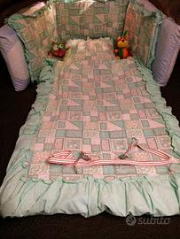 Vendo completo Prenatal per lettino Foppapedretti 0-3 anni composto da paracolpi,fodera copricuscino,trapuntino invernale classico (no copripiumino) e coprilettino estivo.Tutti i pezzi sono bordati con voilant color verde acqua.