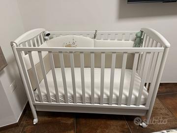 Letto in legno Lucy di Foppapedretti,praticamente nuovo,con rete in doghe di legno,spondina regolabile,4 ruote piroettanti di cui 2 frenanti,cassettone porte oggetti e paracolpi.