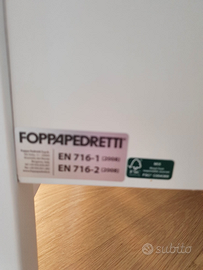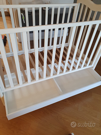 Vendo lettino legno colore bianco modello Foppapedretti Tenerorso acquistato nuovo con sponde che si abbassano e possibilità di posizionare la rete di due livelli (più alto tipo next ti me). Completo di cassettone e ruote con freno, usato per un anno e mezzo. Unico difetto come da foto sponda rosicchiata in un punto. Attualmente per motivo di spazio il lettino è smontanto. Completo di istruzioni, di tutti i componenti e di materasso 60x120 sfoderabile.