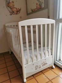 Lettino Foppapedretti con sponda e cassetto, materasso, coprimaterasso, piumino e copripiumino, paracolpi.