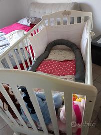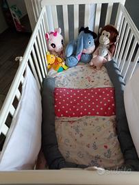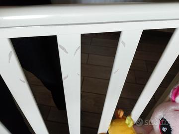 Vendo lettino compreso di materasso con paracolpi e piumone invernale , trapuntina e copri cuscino estivo. Nella parte bassa del lettino c'è una cassettiera ,compreso di ruote per spostarlo. Come si può notare in foto ci sono dei piccoli graffi nelle stecche ma con un po' di vernice il problema è risolto.