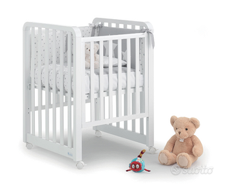 Lettino: utilizzabile da 3 mesi a 3 anni, con rete regolabile in più posizioni, dotata di materasso e completo piumone e paracolpi;
