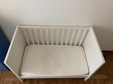 Lettino in legno di colore bianco, con materasso posizionabile a due altezze e sbarre laterali rimovibili, adatto da 0 a 3 anni. Materasso incluso.