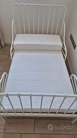 Vendo Lettino in ferro Ikea allungabile colore bianco comprensivo di rete a doghe in legno allungabile e materasso allungabile. Assieme regalo piumino ikea pesantezza media adatto alle misure del lettino.