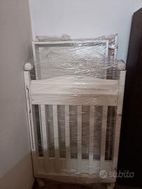 Lettino in legno bianco. Con sbarre e cassettone. 2 piccoli segni su una barra laterale perché ha sbattuto la finestra. Ottime condizioni. Compreso di materasso..