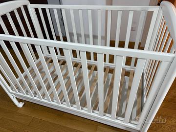 Lettino in legno di colore bianco Foppapedretti con sponda regolabile a due altezze e rete a doghe. Il lettino ha un ampio cassetto inferiore, suddiviso in due scomparti e ruote con sistema frenante per facilitare gli spostamenti. La struttura è verniciata con vernici atossiche ed è 100% made in Italy. Dimensioni cm: H 108 | P 73 | L 131