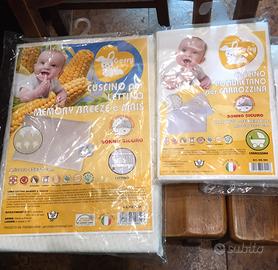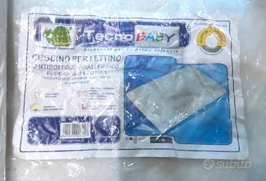 Vendo lettino in legno per bambini, marca PALI (senza materasso) con in REGALO cuscino in cotone paracolpi + TRE CUSCINI NUOVI (cuscino lettino 45x32cm memory breeze e mais, cuscino poliuretano per carrozzina 32x21cm, cuscino antisoffoco-analergico)