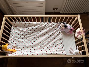 Lettino in legno con materasso, nuovo, usato forse al massimo 3 volte. Le aste dove poggia il materasso sono regolabili in due altezze( in foto altezza più alta). No spedizione, ritiro a mano.