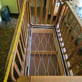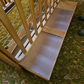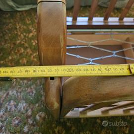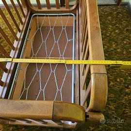 antico lettino per bambini in legno massiccio con cassettiera salvaspazio, quattro spondine laterali regolabili in altezza, dotato di quattro rotelle per lo spostamento, insomma un pezzo unico e raro.