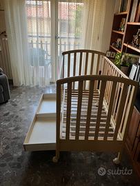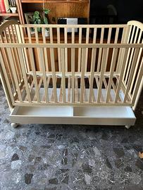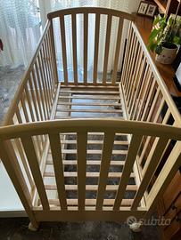 Lettino in legno con ruote come da foto in ottime condizioni, usato solo per due mesi. Dimensioni (LxlxH) 130x70x100 cm. Una sponda abbassabile, cassettone per biancheria. Dotato di paracolpi e coperta-piumino come da foto. No materasso, no lenzuola, no cuscino. Vendita solo per provincia Fermo e province limitrofe. No spedizioni, ritiro presso domicilio venditore. Luogo dell'oggetto: Porto San Giorgio (FM)
