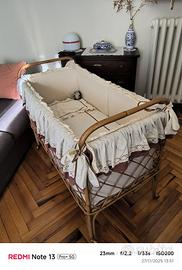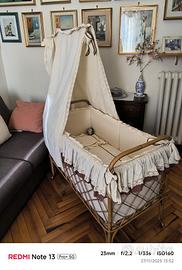 lettino in vimini completo di materasso, set coordinato di lenzuolino, capottina e paracolpi. usato, buone condizioni. ritiro a carico dell' acquirente.