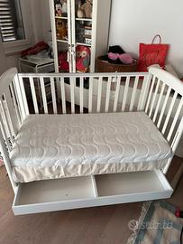 Bellissimo lettino nuovo. Entrambe le sponde scendono, 4 ruote e materasso Giordani nuovo.