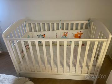 Lettino con struttura in faggio, con vernici atossiche a base acqua, spondine mobili con guaina superiore antimorso. Rete a doghe e cassetto con doppio scompartimento. 4 ruote piroettanti gommate antigraffio di cui due con freno. Misure in cm 130x70x103.