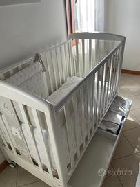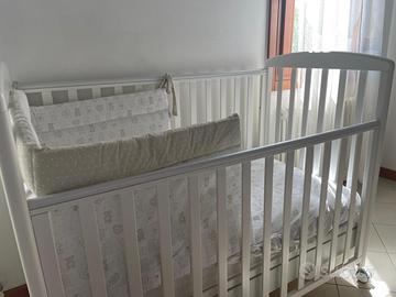 Lettino in ottime condizioni, completo di materasso Lenpur in fibra di legno anallergico, piumino e 2 set lenzuola/copripiumino unisex.