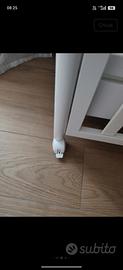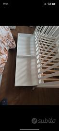 Lettino di legno bianco Alice marchio Giordani, con spondina regolabile,rete a doghe,e quattro ruote proiettanti di cui due con freno. Nella parte inferiore vi è un cassetto estraibile pratico per inserire tutto il corredino del bimbo.