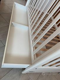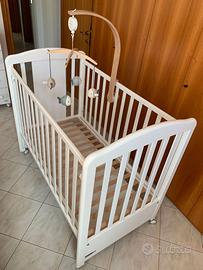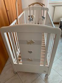Lettino in legno di faggio usato di marca Foppapedretti modello MyDog. In ottime condizioni perchè usato pochissimo, sono ancora funzionanti: - sbarra abbassabbile a scomparsa - cassetto a scorrimento (per lenzuala, vestitini ecc.) - freni due ruote. Dotato di istruzioni per montaggio, tutti i pezzi presenti e in ordine. Base materasso che può essere montata in due altezze diverse. Ora è smontato dentro scatola originale. Dimensioni: 131 x 73 x 109h cm. Peso: 31 kg. Nell'annuncio non sono compresi materasso, giostrina, paracolpi ... accessori sono a parte.