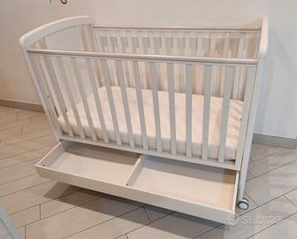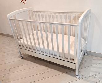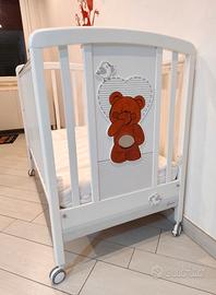 ⁃ Struttura in faggio verniciato bianco docorato con un dolce cuore con orsetto. ⁃ Spondine mobili con guaina antimorso atossica. Rete a doghe. ⁃Cassetto con doppio scompartimento. ⁃ 4 ruote piroettanti gommate antigraffio di cui due con freno. Regalo materasso 60x120X10cm con coprimaterasso Regalo Giostrina musicale arcobaleno della Chicco (Prezzo nuova circa 30€) La struttura presenta qualche graffio di usura ma è perfettamente funzionante. L'orsetto è stato colorato da mio figlio con colori acrilici e protetto con cera. Non spedisco per via delle dimensioni troppo ingombranti. Ritiro a Pontinia o Latina.