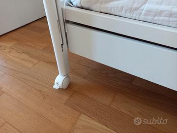 Dotato di doghe, cassetto, sponda reclinabile (non visibile nelle foto, ma presente) e provvisto di rotelle (due col freno) comode per spostarlo.