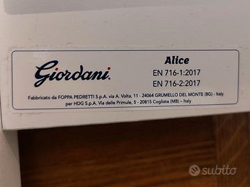 Lettino Giordani da bambino/bambina (prodotto da Foppa Pedretti), modello "Alice", in legno, colore bianco, come nuovo, usato pochissimo.