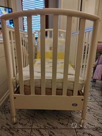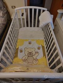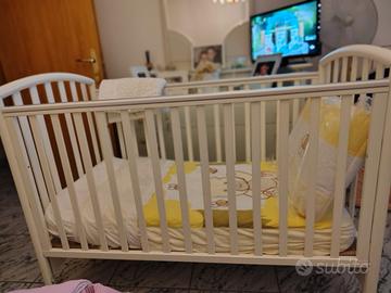 Vendo lettino per bambini in legno bianco marca Palu con sponde regolabili, completo di materasso, rete, paracolpi, sacco piumino, piumino, trapunta estiva e corredino composto da set di lenzuola e coperte di varie dimensioni. Altre foto disponibili