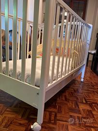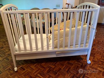 Vendesi lettino mibb bianco comprensivo di paracolpi e materasso. Con cassettone e con sponda del letto movibile. Usato poco in perfette condizioni.