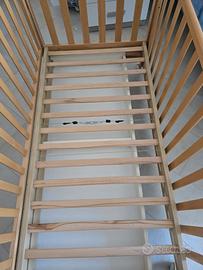 Vendesi lettino MIBB color legno con due cassetti, escluso di materasso; presenta una piccola crepa in un laterale ( come da foto) e alcune delle barre laterali si sganciano (andrebbero incollate).