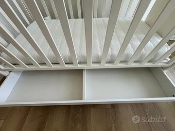 Lettino MIBB in ottime condizioni con decoro a tema orsetto e paracolpi coordinato. Realizzato con materiali naturali e atossici. Dispone di spondine regolabili in altezza, comodo cassettone inferiore a due scomparti e ruote piroettanti di cui due con freno per facilitare spostamenti e garantire stabilità. Possibilità di acquistare separatamente anche materasso usato pochissimo, praticamente nuovo, al costo di 20 euro.
