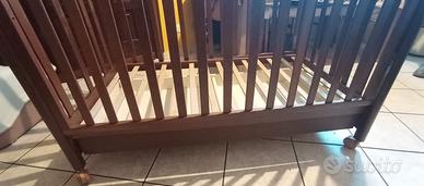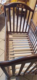Lettino MIBB in noce, con sponde abbassabili, cassetto porta vestitini/ biancheria, rete a doghe, paracolpi e copriletto.