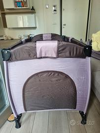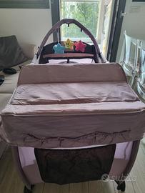 Lettino TECTAKE con 2 rotelle con freno, regolabile in altezza, dotato di borsa da trasporto, fasciatoio, arco con giochini e tasche laterali. Dimensioni 132x 75x 104. Il fasciatoio è progettato per bambini fino a 12 mesi e fino a 11 Kg di peso.