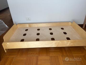Vendo lettino basso montessoriano per divezzi, per favorire l’autonomia dei bambini che possono entrare e uscire facilmente da soli. Dimensioni: cm 123X62X26h. Legno di betulla. Spigoli e bordi arrotondati. Fondo con fori per favorire l'areazione. Finitura naturale. Ignifugo classe 2. Materasso non incluso. Impilabile. Conforme ai CAM (Criteri Ambientali Minimi) e ai principi del DNSH (Do No Significant Harm).