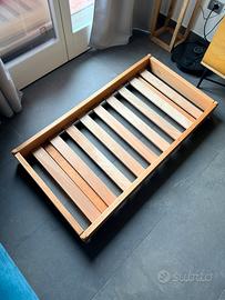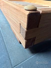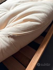 Lettino montessoriano artigianale a doghe per bambini misure esterne 126x66cm, interne 120x60cm in legno Okumé naturale con materasso futon 120x60cm 100% cotone naturale a 4 falde del famoso marchio Vivere Zen.