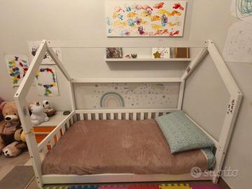 Lettino montessoriano per bambini 80x160 cm in legno di pino bianco con sponde e doghe.
