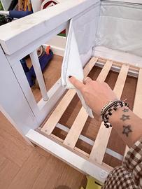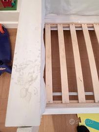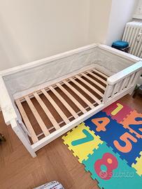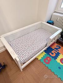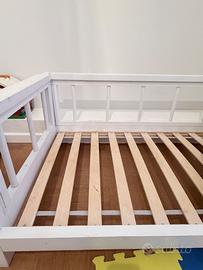Lettino stile montessoriano con doghe in legno dimensioni 83X156 rialzato leggermente da terra per favorire la pulizia. Il lettino prevede un perimetro di sicurezza in legno con accesso del bambino frontale. Sull’intero perimetro è stata realizzata una imbottitura leggera in tessuto grigio per evitare colpi del bambino sul legno completamente staccabile e lavabile in lavatrice. Inoltre, compreso nel prezzo, c’è un materasso 70X140 alto 14 cm in poliuretano espanso waterfoam, ortopedico anallergico e antiacaro con fodera in aloe vera acquistato a 90 euro. Ritiro Roma San Giovanni