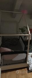 Lettino in legno bianco, utilizzabile come next to me nei primi mesi e poi come letto singolo. Compresa anche casetta montessoriana incastrabile sul telaio, per appendere giochi o altro.
