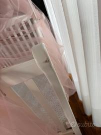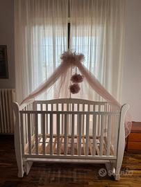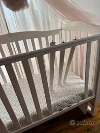 Lettino per bambini con pendolo, colore bianco. In vendita con materasso. Rete a doghe con due livelli di regolazione in altezza, doghe rinforzate. Parete laterale rimovibile con affidabile meccanismo di abbassamento (può essere abbassata o rimossa completamente). Tutte le parti della culla hanno forme arrotondate e superfici lucide e sicure. La culla è realizzata in legno duro di alta qualità. Nella foto sono evidenziate delle sfumature di usura. Per il resto la condizione è perfetta.
