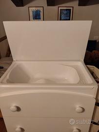 - cassettiera fasciatoio, ruote con freno, materassino superiore, di colore bianco, marca Azzurra Design, prezzo €150.