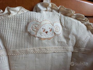 In regalo, paracolpi e trapuntina copriletto coordinati, materasso e fasciatoio in gommapiuma portatile.