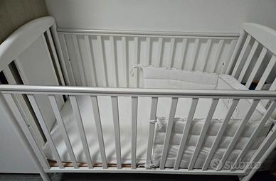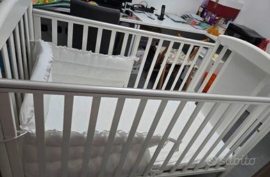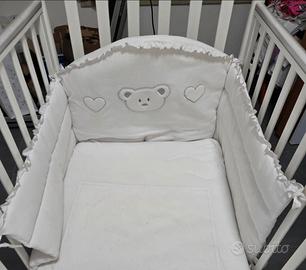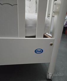 Vendo bellissimo lettino per neonato di marca Pali, di colore bianco. Come si può vedere dalle foto, è tenuto in ottime condizioni ed è completo di tutto il necessario per la nanna. Il lettino è dotato di ruote piroettanti con freno, per spostarlo facilmente e bloccarlo in sicurezza. Ha anche la spondina mobile per un accesso più comodo al bambino. È caratterizzato da una decorazione molto dolce: un simpatico orsetto con la scritta "Bear" sul pannello principale, accompagnato da delicati cuoricini ricamati nel set tessile. Inclusi nell'offerta: Il lettino completo. Materasso su misura. Set tessile completo di colore bianco con ricami, come visibile in foto, che comprende il paracolpi su tre lati. Il lettino è già stato sanificato ed è pronto all'uso.
