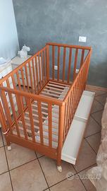 Lettino neonato color ciliegio, cassetto a scomparsa, sponda e rete regolabili in altezza. Pari al nuovo, materasso compreso