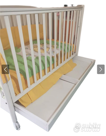 -2 ruote piroettanti (2 con freno) -Sponde mobili -Guaina atossica protettiva -Rete a doghe -Cassetto porta-oggeti -Paracolpi sfilabile -Dimensioni: 133 cm lunghezza x73 cm larghezza x 108 (altezza max) -Peso: circa 25 Kg. Marca Pali. Completo di materasso nuovo, coperta, paracolpi, giochi vari. Tutto Compreso