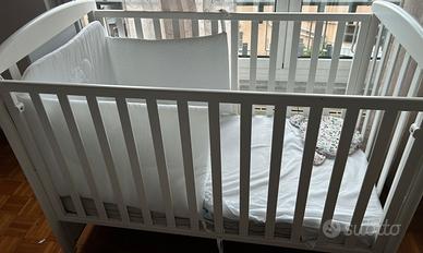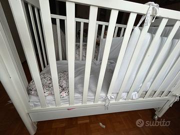 Lettino pali bianco con cassettiera, con qualche piccola imperfezione. Possibilita’ di abbassare completamente una sponda sino a trasformare il lettino in “divano” . Si vende con materasso. Ritiro a mano e a carico dell’acquirente.