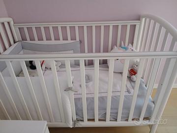 Vendo lettino bianco modello Pali in ottimo stato con cassetto e sponde mobili e guaina protettiva antimorso. Disponibile eventualmente anche materasso, paracolpi e piumone.