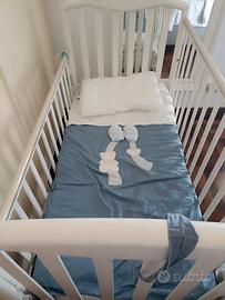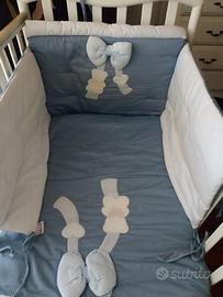 Materasso antisoffoco, paracolpi, tasca portaoggetti, piumino e copripiumino Picci coordinati blu avion in dotazione.