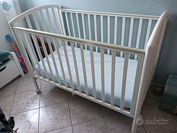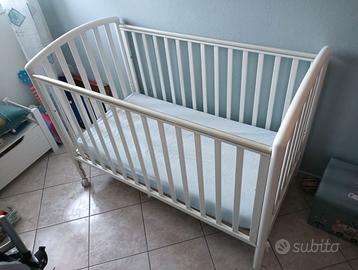 Vendo lettino Pali modello Ciak di colore bianco, realizzato in legno di faggio massiccio e in ottime condizioni generali. Si tratta di un modello molto versatile che offre la massima praticità grazie alla sponda regolabile con il sistema Pratico e alla rete posizionabile su due diverse altezze per seguire la crescita del bambino. La struttura include un comodo e ampio cassetto sottostante per riporre la biancheria e quattro ruote piroettanti, di cui due dotate di freno per garantire la massima stabilità. Le sponde sono inoltre complete di guaina protettiva antimorso. Il prezzo del solo lettino è di 100 euro con ritiro esclusivamente a mano. Per chi fosse interessato, posso fornire anche il materasso completo di fodera con dimensioni 121x62x10 cm al prezzo aggiuntivo di 20 euro.