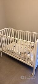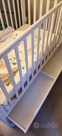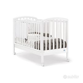 Lettino per infanzia 70x120 con sponda abbassabile e doghe del materasso posizionabili su due livelli. Colore bianco laccato. Il prezzo include -materasso -piumino -paracolpi -cuscino neonatale