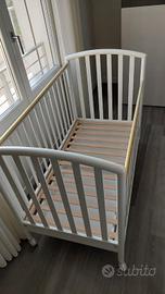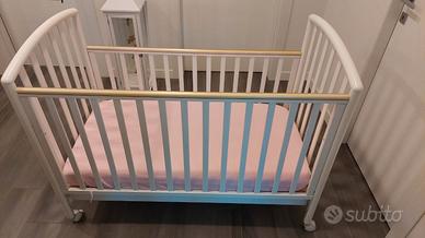 Lettino PALI in legno bianco, con cassetto, materasso compreso. Dotato di sponda regolabile e ruote girevoli rivestite in gomma.