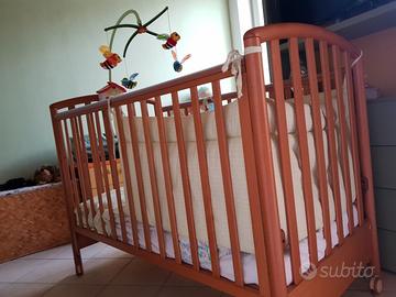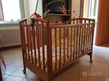 lettino Pali color noce con sbarra laterale abbassabile e doppia posizione del materasso, cassettone, materasso, paracolpi, cuscino allattamento (no foto), piumone, 2 set di lenzuola x femmina (no foto), gioco delle api. ottime condizioni. gia' smontato x questioni di spazio.