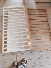 Rete ortopedica interamente realizzata a doghe di legno con due posizioni: per il neonato si sistema in alto, facilitando così il lavoro della mamma, si sistema più in basso quando il bambino sa già arrampicarsi e ha bisogno di sponde alte per non cadere.