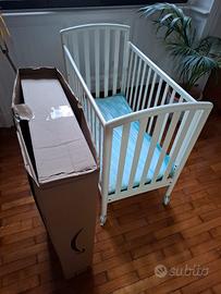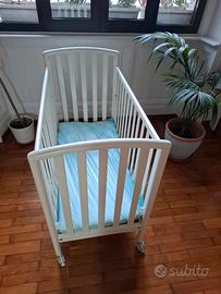 Lettino bianco Pali con regolazione altezza e ruote. Due materassi a disposizione.