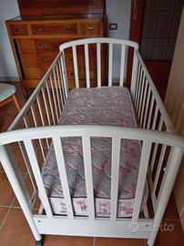 Lettino in legno laccato color bianco con cassettiera, completo di materasso e